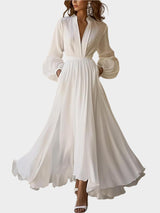 Rochia maxi albă cu mâneci bufante întruchipează eleganța supremă și stilul atemporal. Cu un decolteu adânc în V, siluetă fluidă și mâneci lungi impresionante, este perfectă pentru fiecare moment special – de la nunți și evenimente formale până la seri romantice.