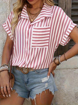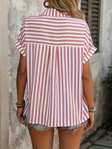 Bluza Lilou Elegantă cu Dungi aduce o eleganță ușoară ținutelor de zi cu zi. Având o închidere cu nasturi în față, mâneci scurte pliate și un buzunar contrastant pe piept, oferă o interpretare jucăușă a unei siluete clasice. Materialul ușor menține respirabilitatea și lejeritatea, făcând-o perfectă pentru a fi purtată elegant sau casual.